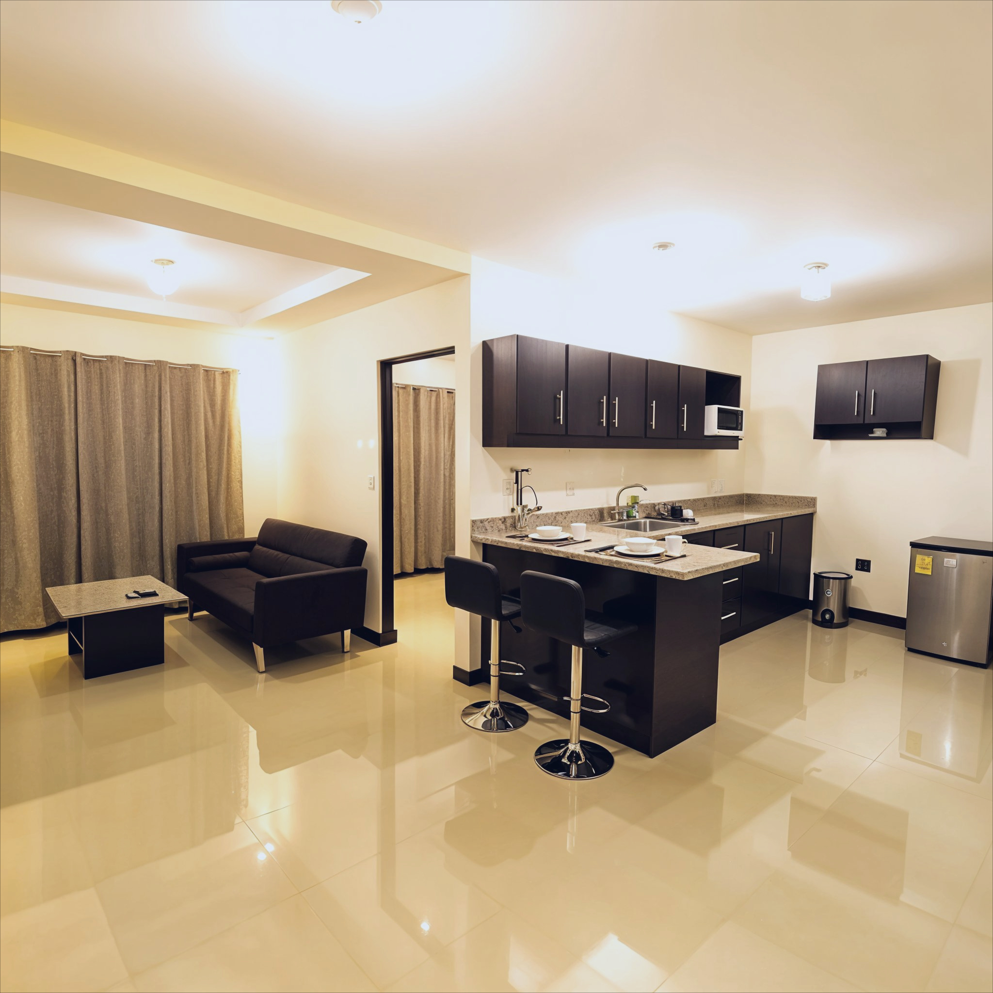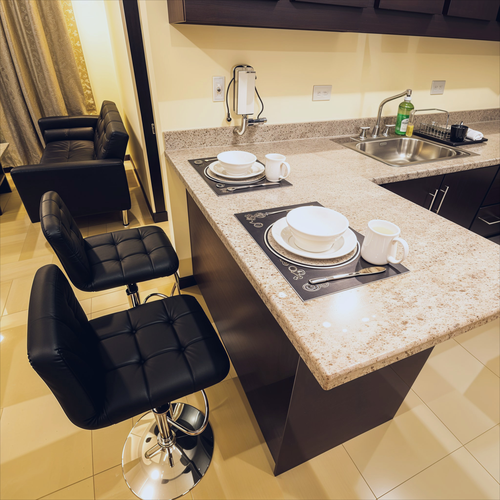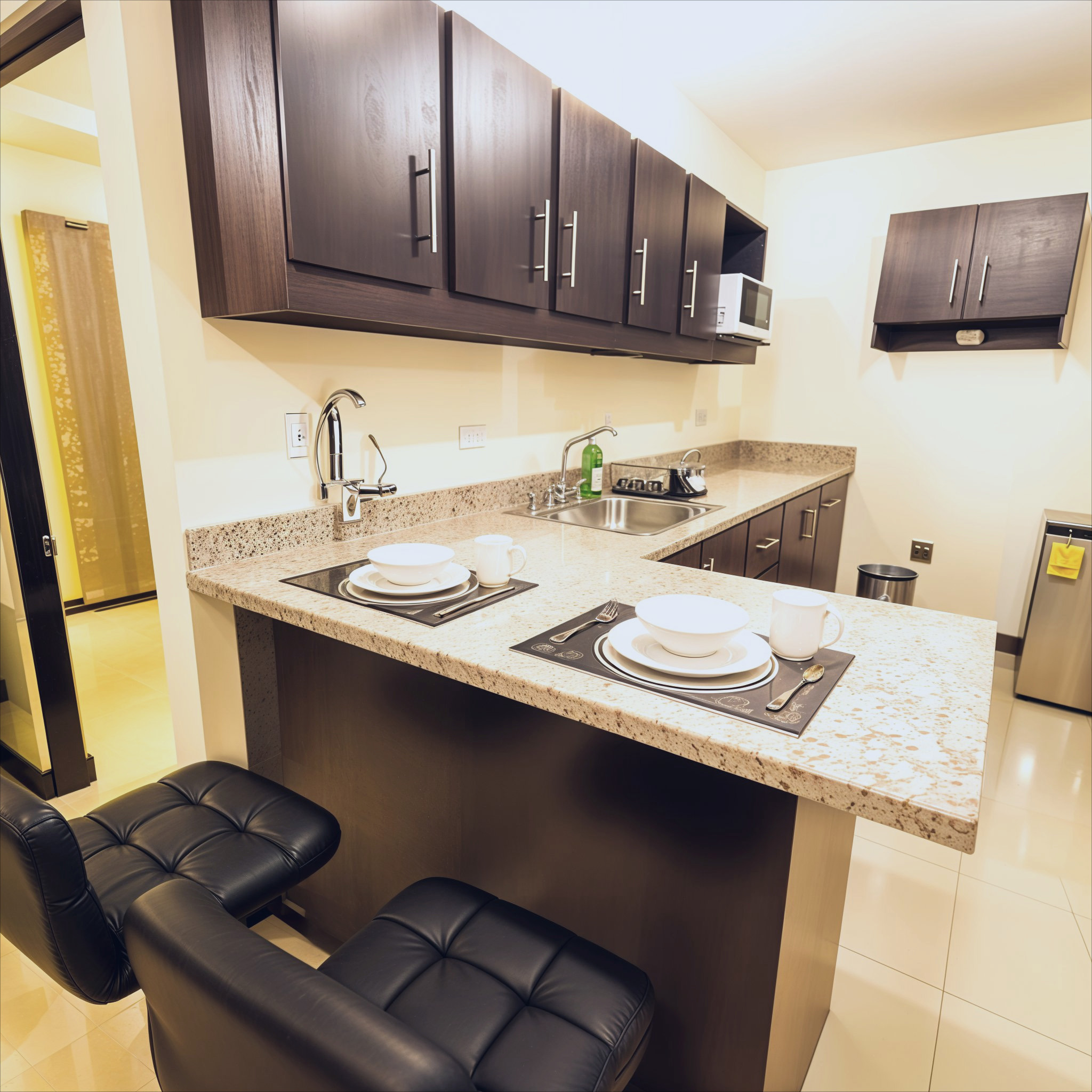 - Cocina con desayunador en melamina y sobres de granito.