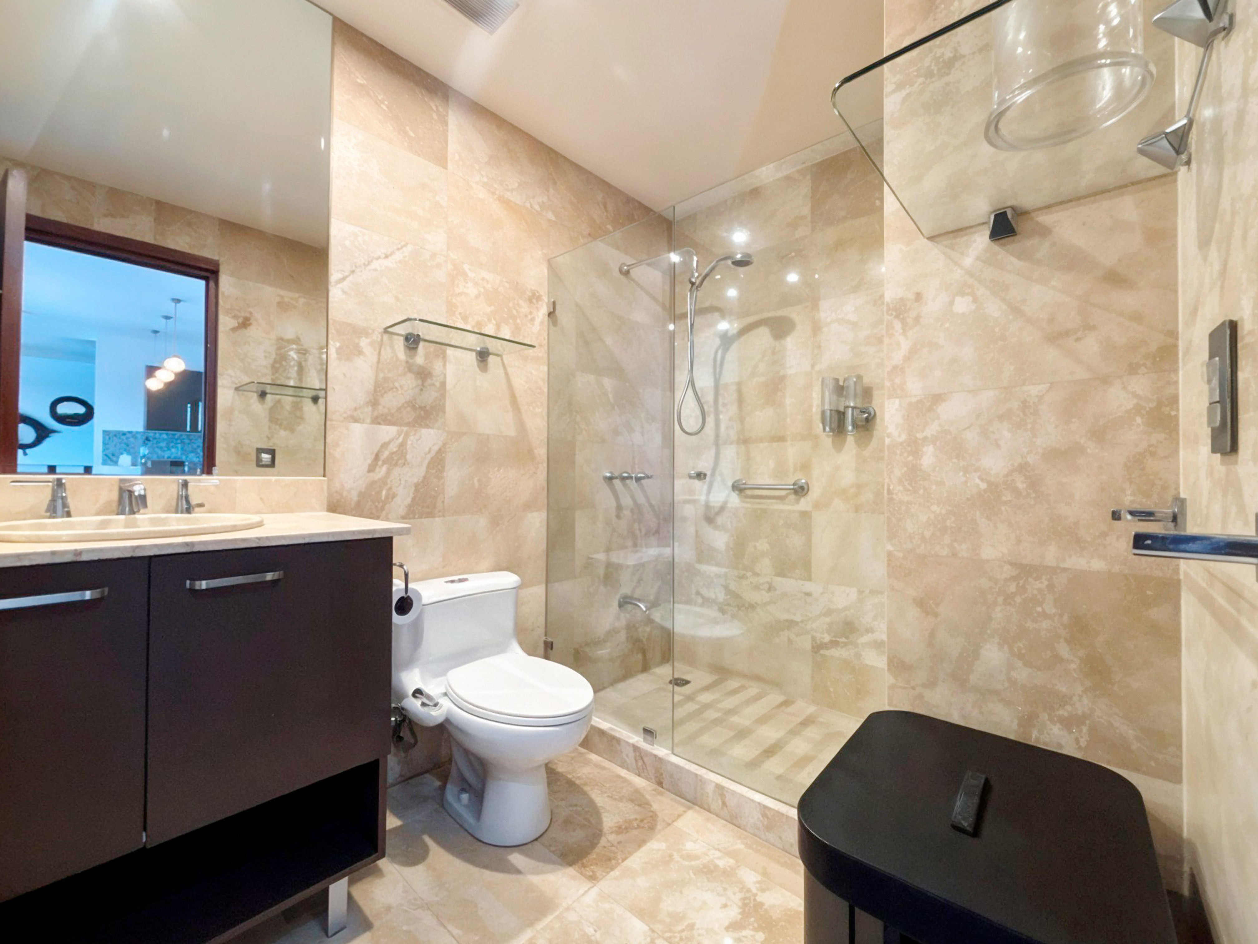 • Baño revestido en travertino